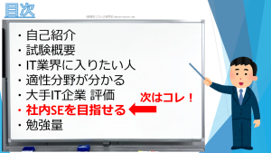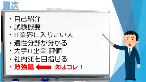 優良企業の社内SEだと本当に倍率が高いので、基本情報技術者試験だけでなく応用情報や高度情報技術者試験にも合格していくのがベストです!
