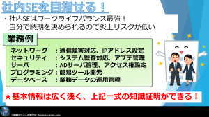 基本情報技術者試験のメリットとして、社内SEを目指せるという点もございます。