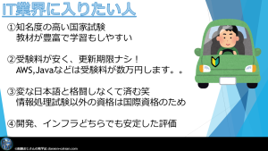 基本情報技術者試験を含めた情報処理技術者試験は日本の国家試験ですが、それ以外のメジャーなIT資格であるAWSやJava、CCNAなどは海外の国際資格となっております。