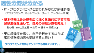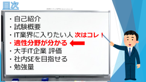続いての基本情報技術者試験を受験するメリットは、「適性分野が分かる」ですね。