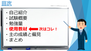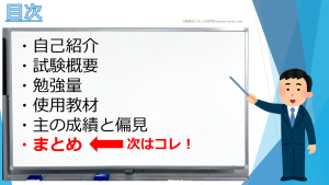 いずれにしても、最低でもこのスライドに載ってる教材全ては理解できるレベルじゃないと1発合格は難しいんじゃないかなぁというのが正直な感想です。