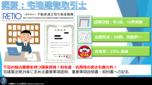 宅建は宅建業法で定められている重要事項の説明、それに伴う書類への記名などの独占業務を持つ国家資格となっております。